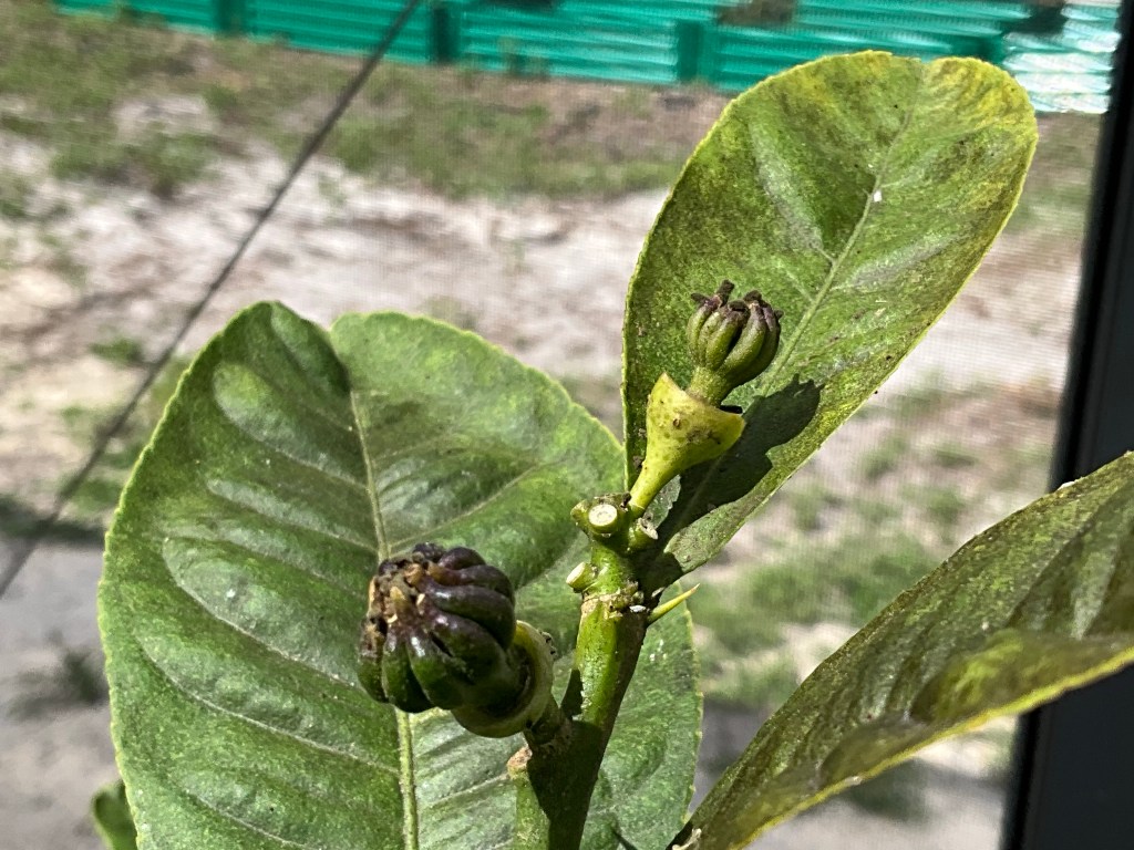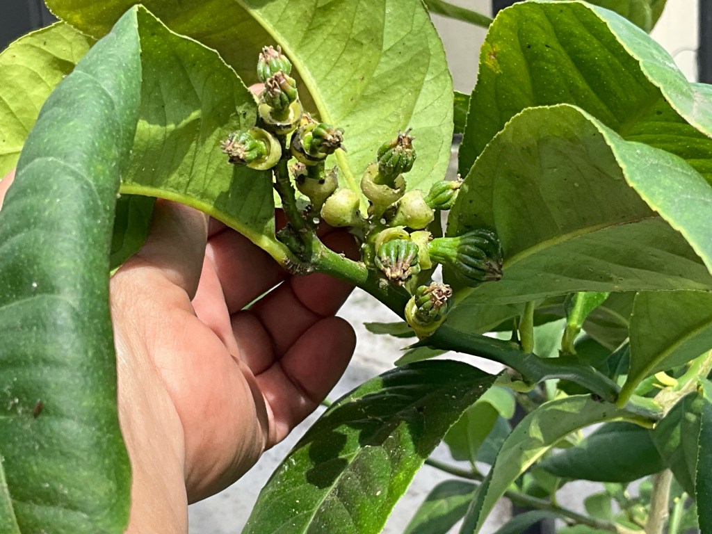 Because I have not had a much luck with citrus here, I opted to put my new tree in a large pot. Last year, I had three flowers, no fruit. This year though it appears that I may be the lucky owner of several Buddhas hand fruits!