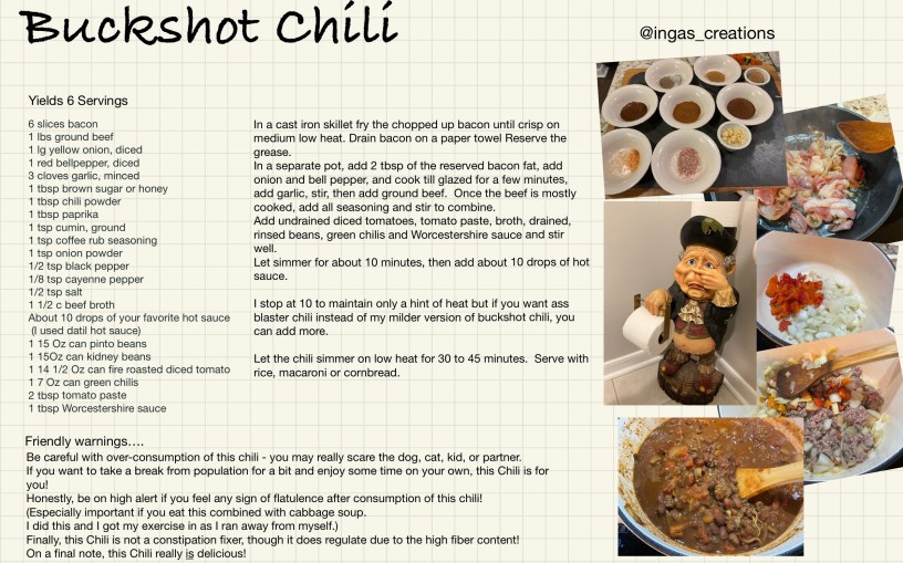 Happy Sunday everyone! I have added my latest Chili recipe below, and while the printout has its own warnings, I want to repeat them just in case….