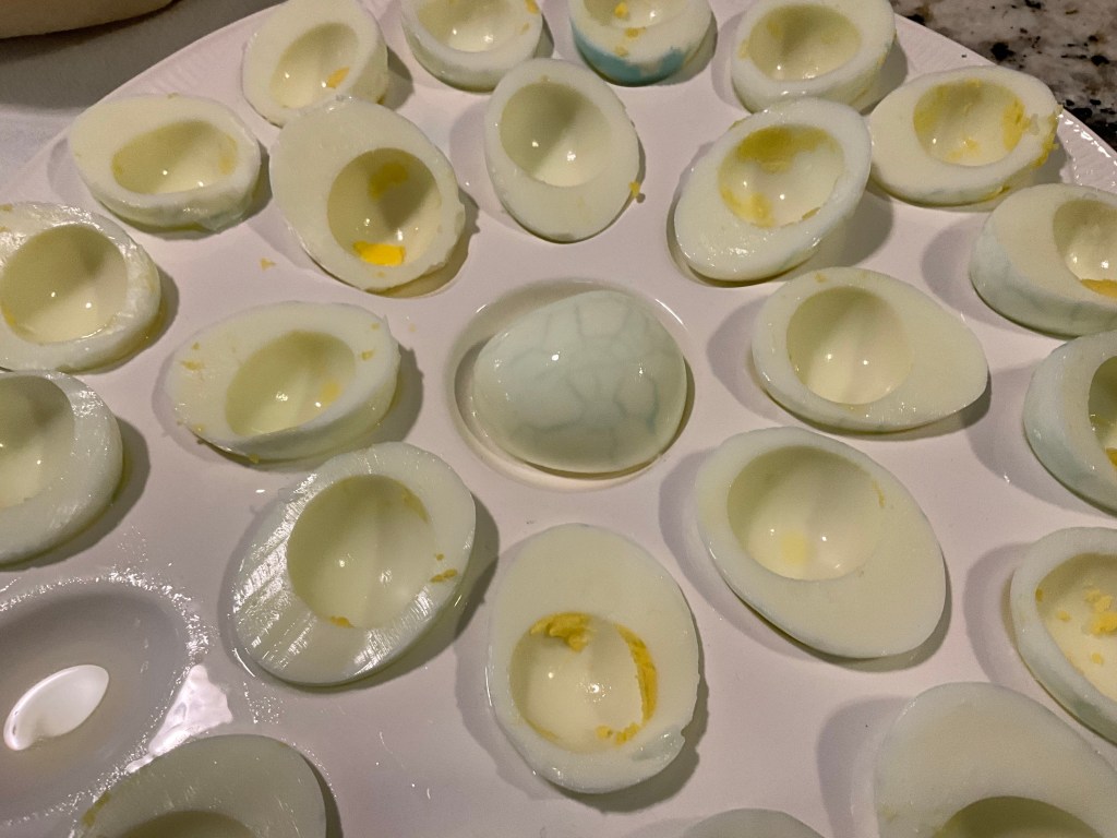 Remove eggs from the boiling water and then add them to a bowl of cold water to scare them. When I made eggs yesterday, I had gently cracked the eggs with a spoon, and then added them to the cold water which had 6 drops of blue food coloring in it to try to create webbing on the eggs. It kinda worked but as the eggs sat out they sweated and the coloring disappeared, so i would say save yourself the hassle of webbing and if you do. Then do not do the suggested 2 hoTo really get the egg webbing to show up dark enough.ur minimum, rather, i think it is more like 6 to 8 hours rest time. To really get the egg webbing to show up dark enough. Also, you do not want to use super fresh eggs, because peeling them will be a bear. You can add a tbsp of vinegar to the water when you are boiling them to make peeling a bit easier.