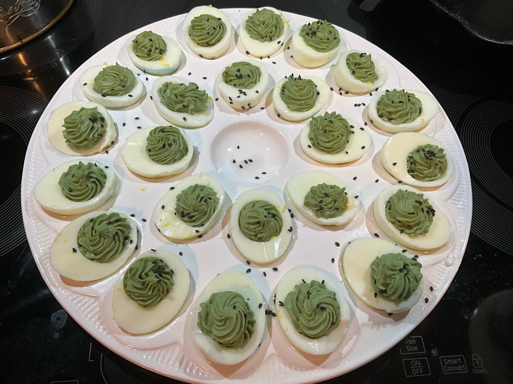 I split the eggs length wise, then I separated the white from the yolks. I added the yolks to the remaining ingredients except the black sesame seeds, and then mixed them to a smooth paste with a mixer. You could also add relish to the egg yolks to give it additional pizzaz….People thought I had stuffed them with avocado! I used a pastry spout to make them kind of fancy looking.