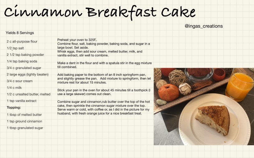Baking, Breakfast, Recipes Quick Cinnamon Breakfast Cake Date: November 2, 2023Author: Inga Montalvo 0 Comments I played around in the kitchen this morning and the result was a very simple cinnamon breakfast cake! Enjoy! Share this: Click to share on Facebook (Opens in new window) Facebook Click to print (Opens in new window) Print Click to email a link to a friend (Opens in new window) Email Click to share on Pinterest (Opens in new window) Pinterest Click to share on WhatsApp (Opens in new window) WhatsApp Like Loading... Related