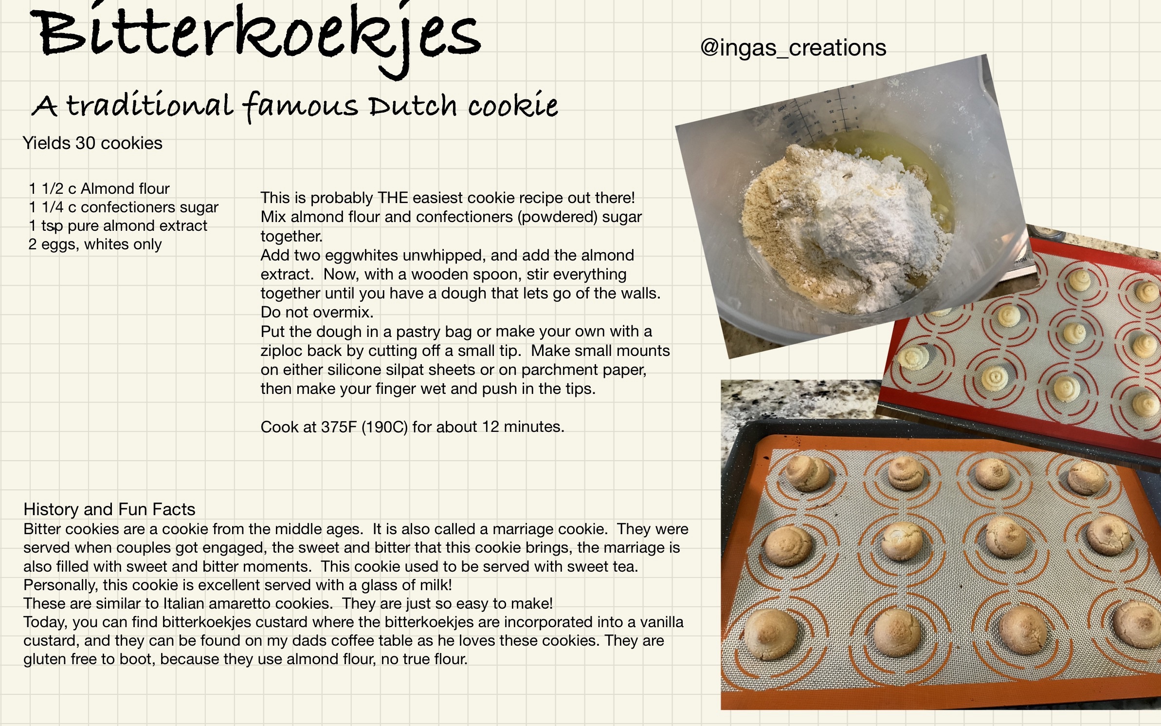 Baking, Baking, Cookies, Dutch stuff, Family, Recipes Bitterkoekjes/ Amaretto cookies Date: December 19, 2023Author: Inga Montalvo 0 Comments The Dutch version of these Almond cookies is so easy to make! Share this: Click to share on Facebook (Opens in new window) Facebook Click to print (Opens in new window) Print Click to email a link to a friend (Opens in new window) Email Click to share on Pinterest (Opens in new window) Pinterest Click to share on WhatsApp (Opens in new window) WhatsApp Like Loading... Related