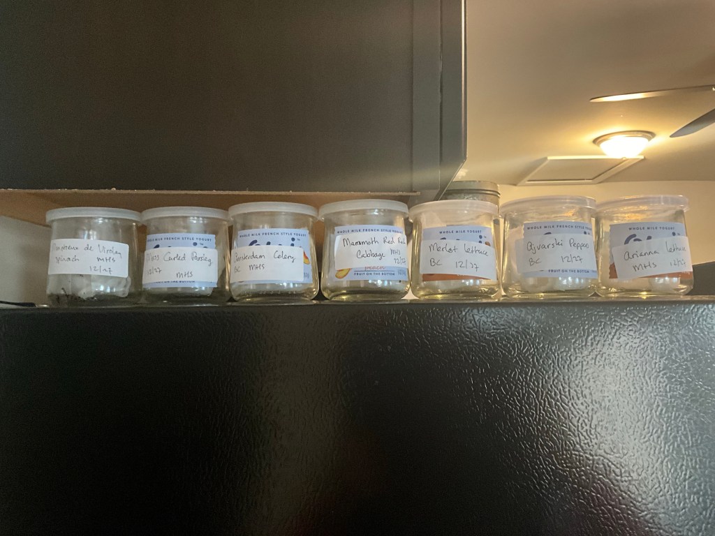 I have some new growing trays on order and a heating mat, though I am just too darn excited to get started so I got my little yoghurt jars out and some paper towels, and decided to give the top of the fridge a try for the time being. We shall see how this pans out!