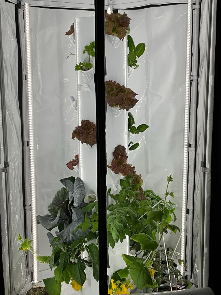 For Christmas, I got an Aerospring garden tower, which is a hydroponics system. Ofcourse, I started my seeds immediately so that I could get a head start on spring. I have lettuce, parsley, cilantro. some cabbage, a tomato plant, some peppers, and miniature white cucumbers.